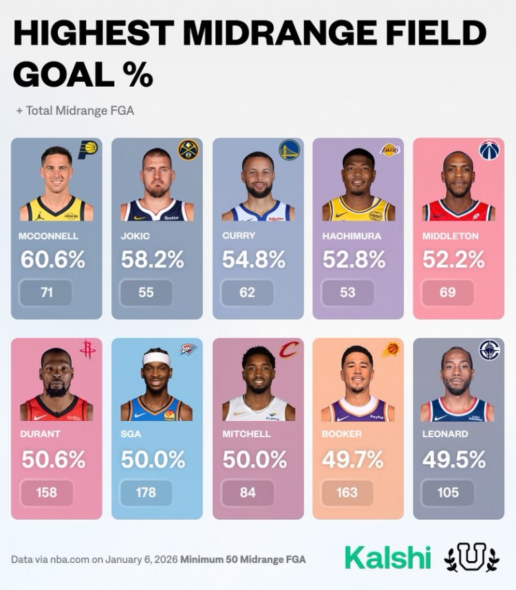 本赛季中投命中率前10:麦康纳第1 库里第3 KD第6 小卡第10